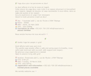 Dans un cadre bienveillant, nous prenons le temps de respirer, d’étirer le corps et d’apaiser l’esprit. Que vous soyez débutant(e) ou pratiquant(e) régulier(ère), cette séance est ouverte à toute personne en deuil.